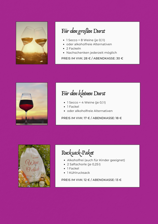Wähle dein passendes Paket für die stimmungsvolle Fackelwanderung durch die Weinberge von Bleichheim – mit regionalem Wein, Lagerfeuer-Romantik und einem gemütlichen Feierabendhock.